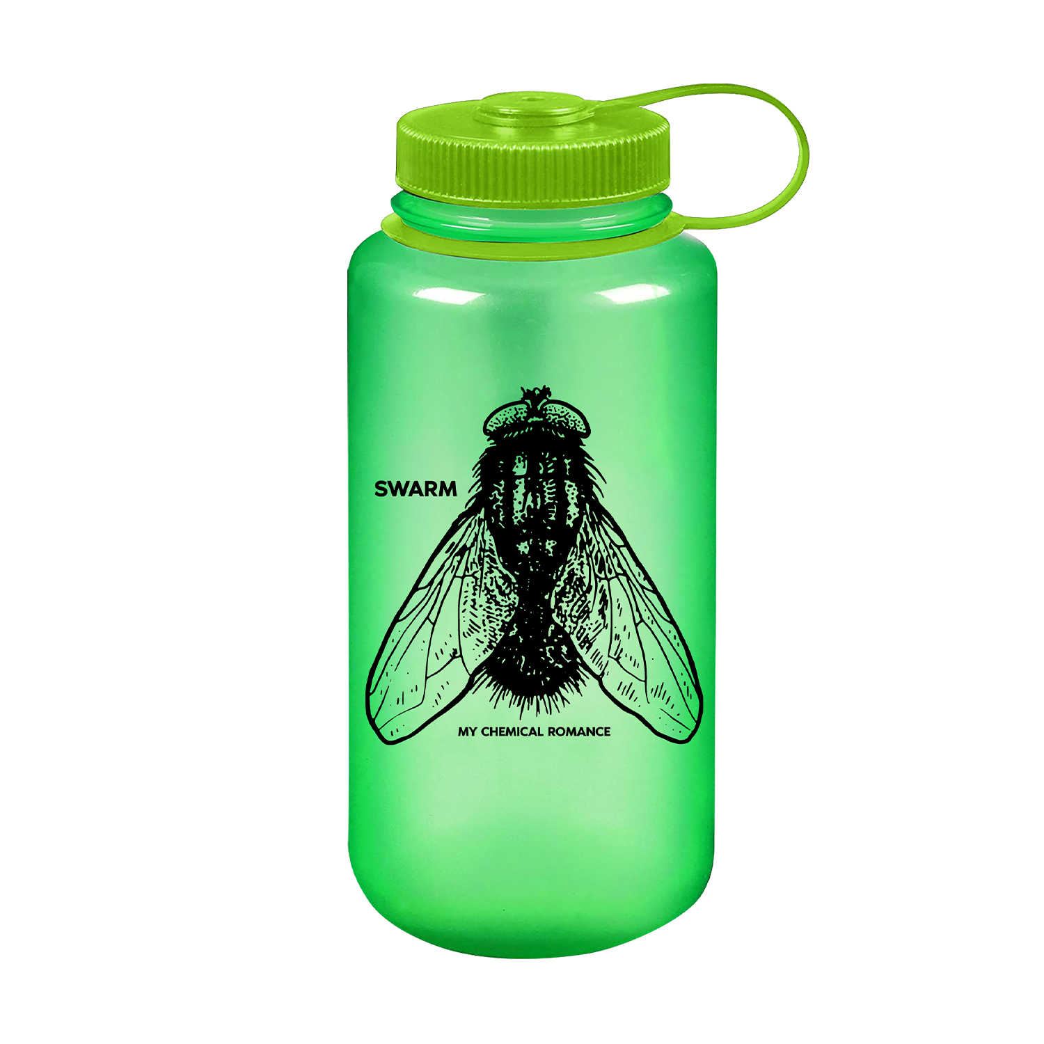 SWARM FLY logo on a safety green 32oz wide mouth Nalgene plastic water bottle.